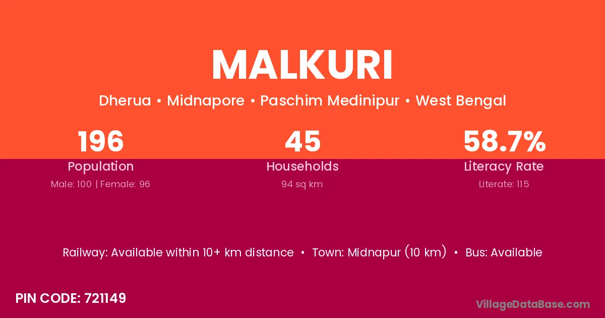 Midnapur (10 km) is the nearest town to Malkuri village for major economic activities and is located approximately 10 km away.
