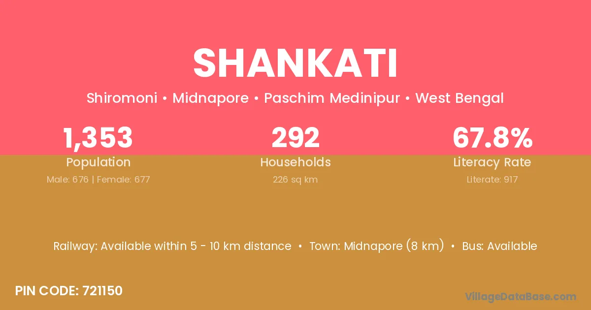 Midnapore (8 km) is the nearest town to Shankati village for major economic activities and is located approximately 8 km away.