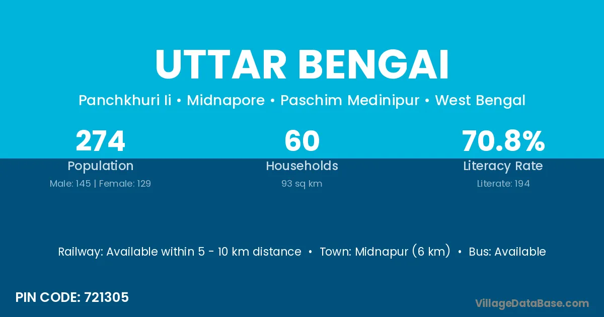 Midnapur (6 km) is the nearest town to Uttar Bengai village for major economic activities and is located approximately 6 km away.