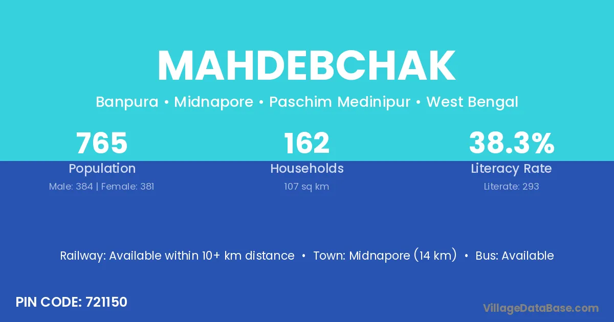Midnapore (14 km) is the nearest town to Mahdebchak village for major economic activities and is located approximately 14 km away.