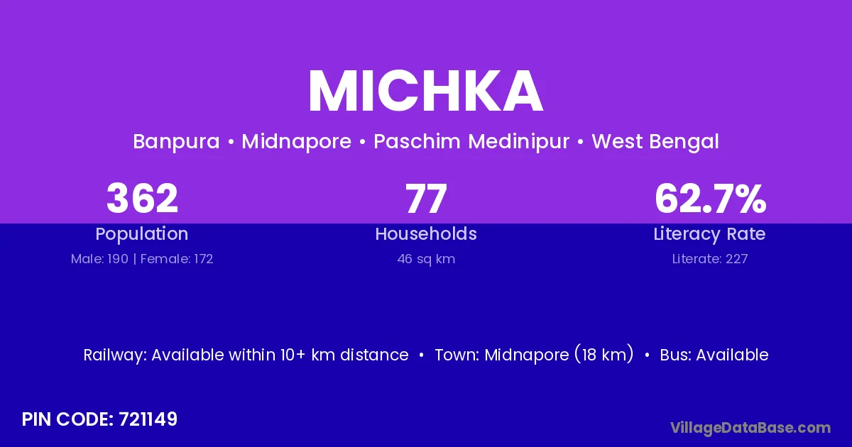 Midnapore (18 km) is the nearest town to Michka village for major economic activities and is located approximately 18 km away.