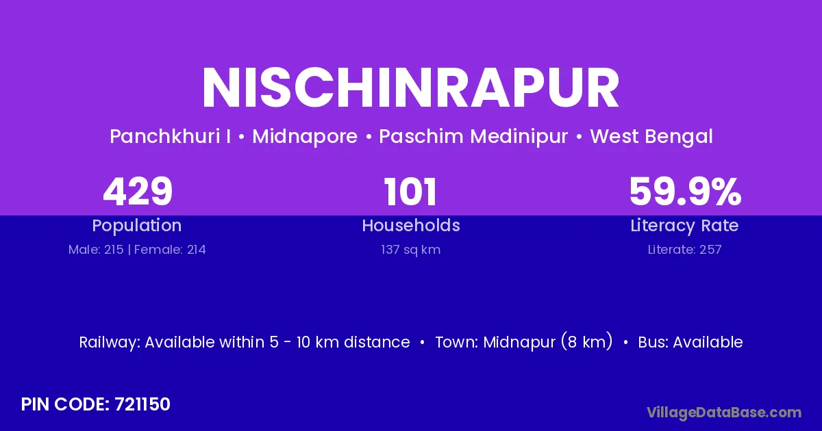 Midnapur (8 km) is the nearest town to Nischinrapur village for major economic activities and is located approximately 8 km away.