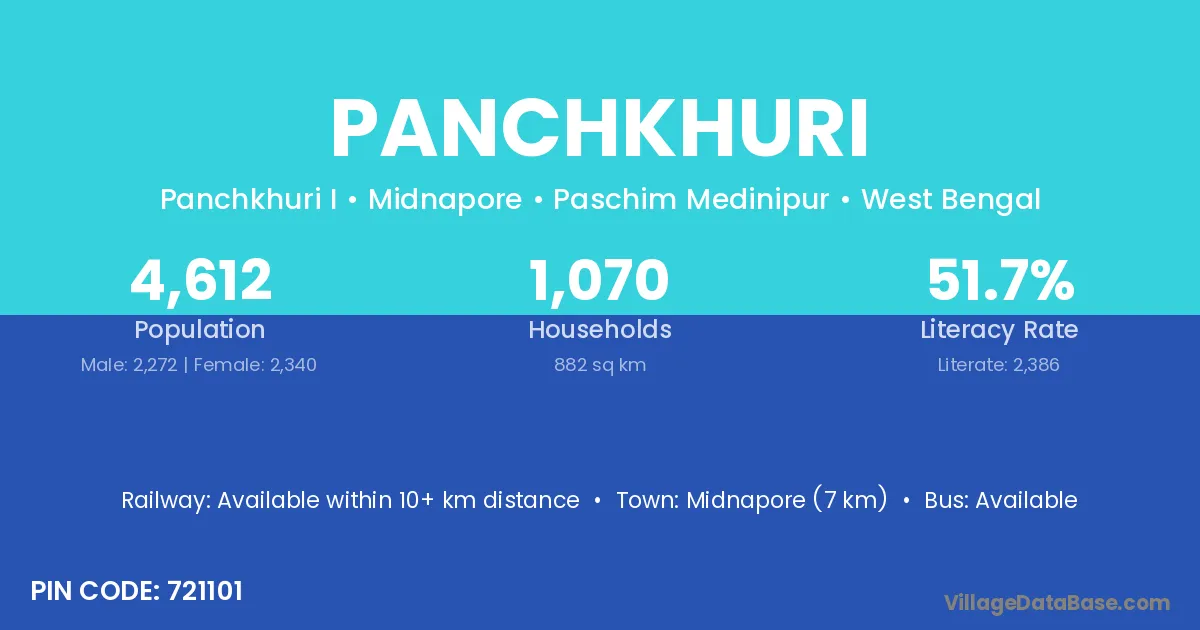 Midnapore (7 km) is the nearest town to Panchkhuri village for major economic activities and is located approximately 7 km away.