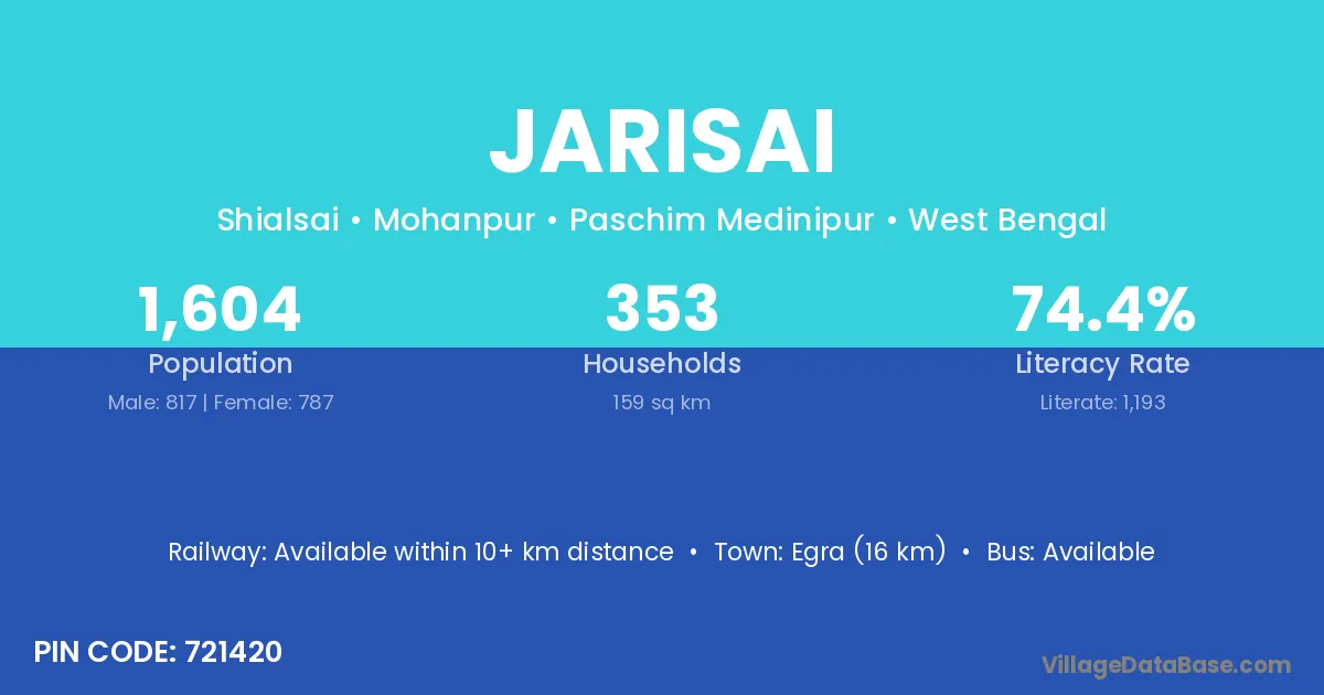 Egra (16 km) is the nearest town to Jarisai village for major economic activities and is located approximately 16 km away.