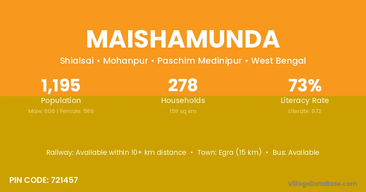 Maishamunda village is located in the Mohanpur Subdivision of the Paschim Medinipur district in West Bengal.