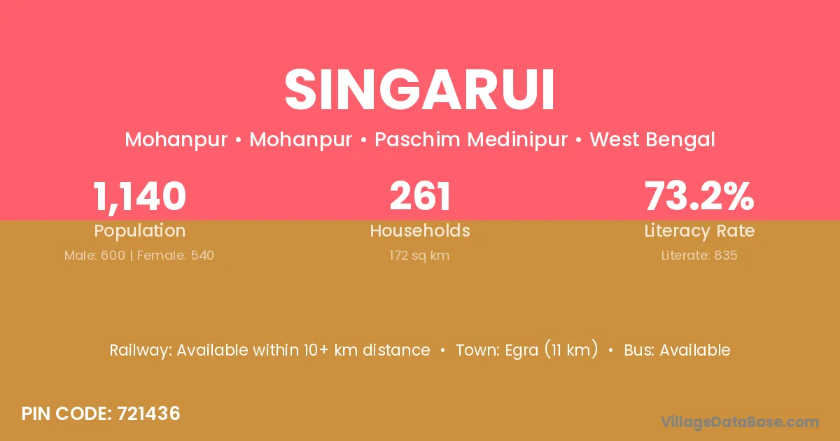 Egra (11 km) is the nearest town to Singarui village for major economic activities and is located approximately 11 km away.