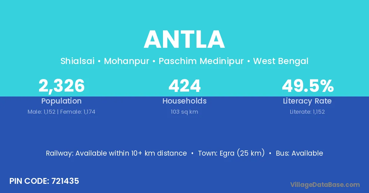 Egra (25 km) is the nearest town to Antla village for major economic activities and is located approximately 25 km away.