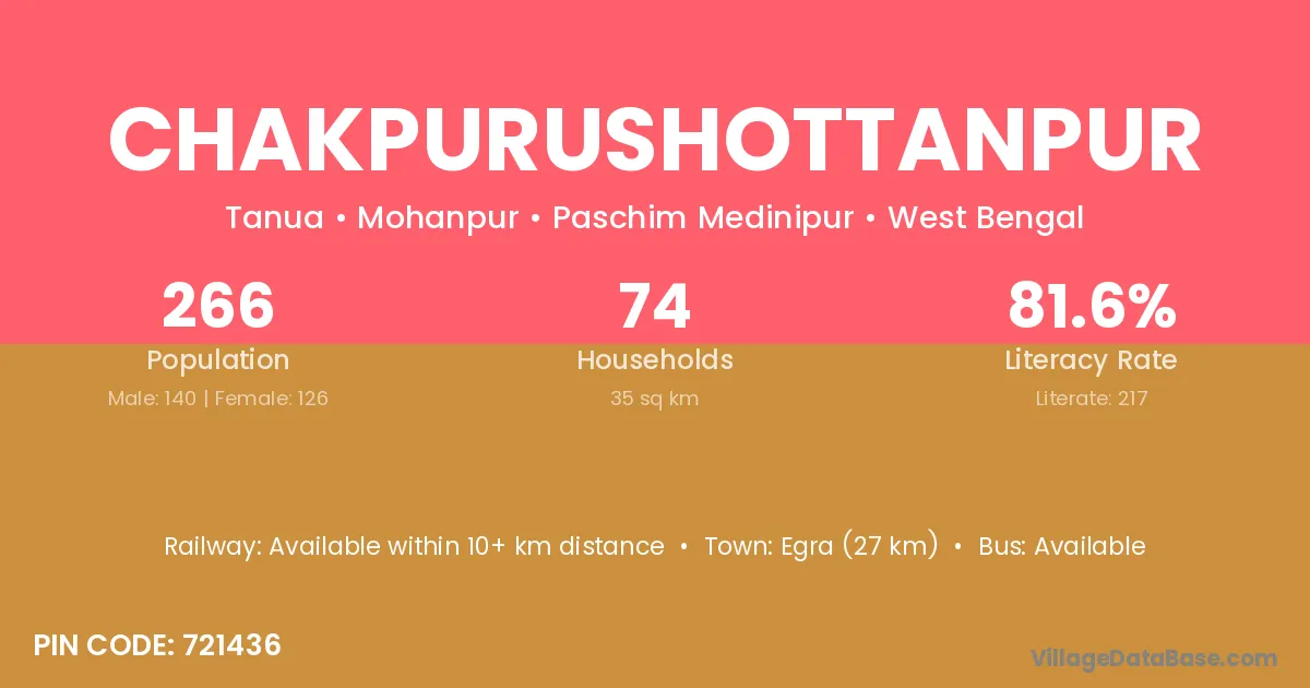 Egra (27 km) is the nearest town to Chakpurushottanpur village for major economic activities and is located approximately 27 km away.