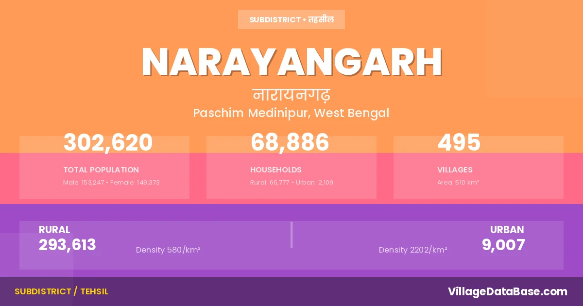 According to the 2011 census The total area of Narayangarh Subdivision is 510 km², with a population of 302620 people. The population density is 593 inhabitants per square kilometre, and there are approximately 68886 houses in the sub district.