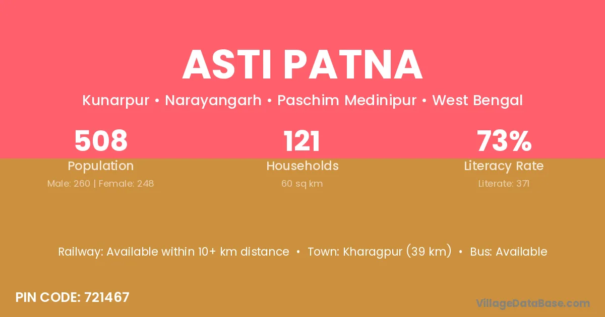 Asti Patna village has a total population of 508 people, of which 260 are males and 248 are females.