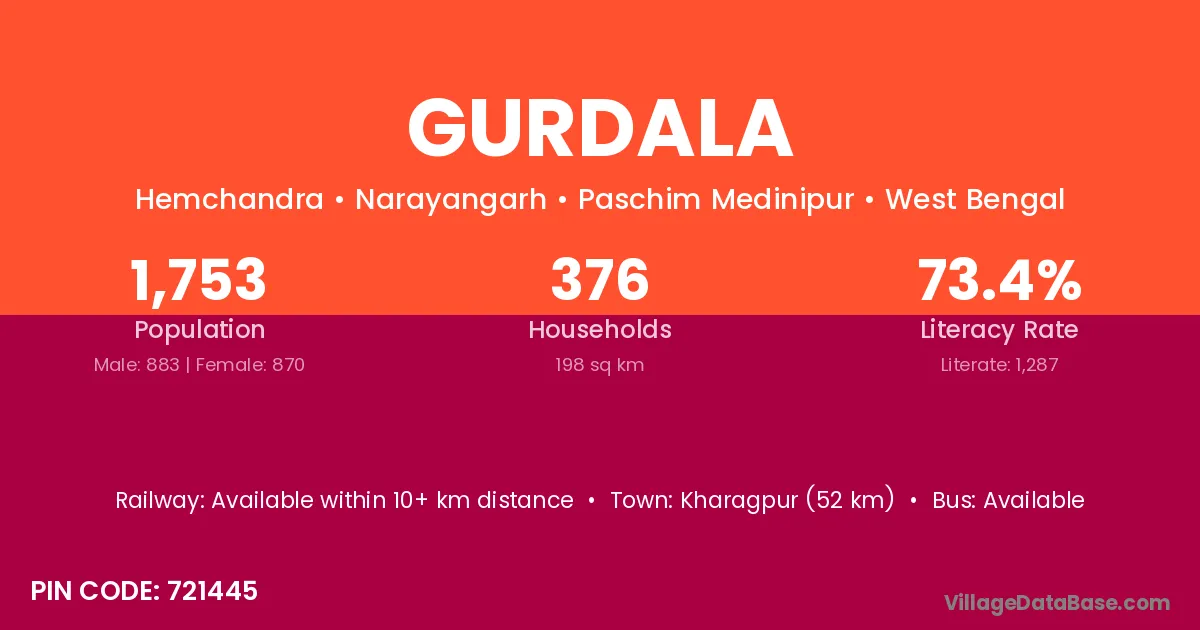 Kharagpur (52 km) is the nearest town to Gurdala village for major economic activities and is located approximately 52 km away.