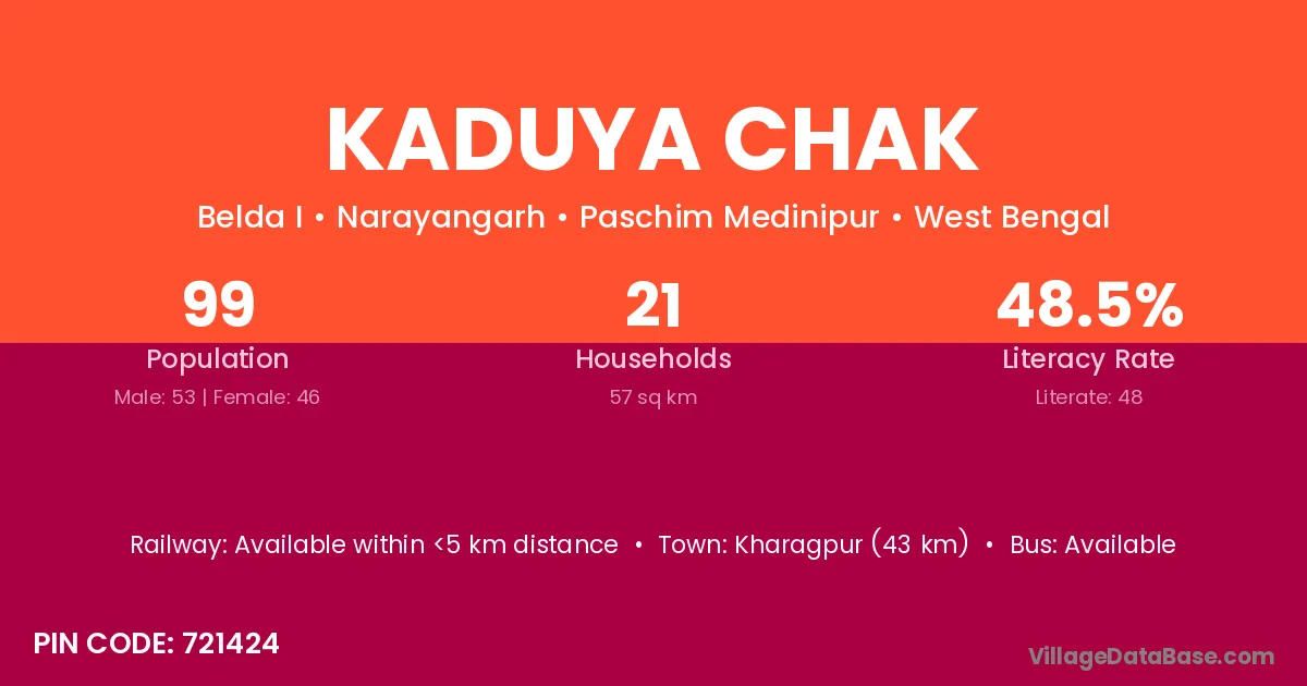 Kharagpur (43 km) is the nearest town to Kaduya Chak village for major economic activities and is located approximately 43 km away.