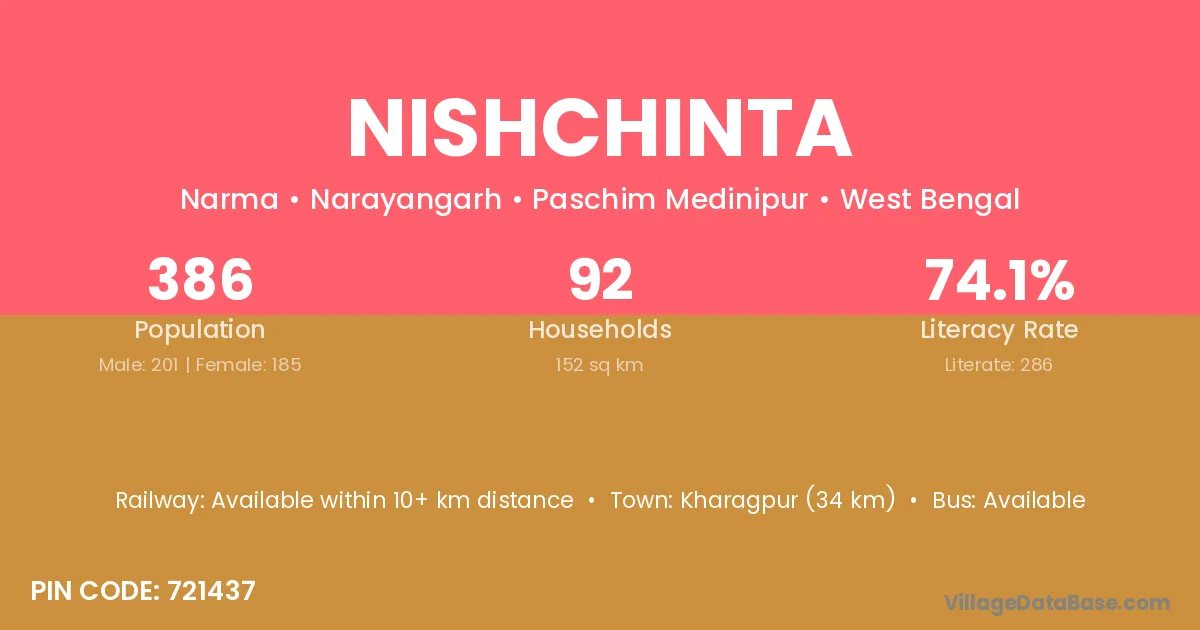 Kharagpur (34 km) is the nearest town to Nishchinta village for major economic activities and is located approximately 34 km away.