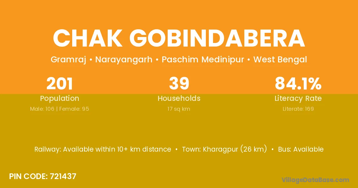 Kharagpur (26 km) is the nearest town to Chak Gobindabera village for major economic activities and is located approximately 26 km away.