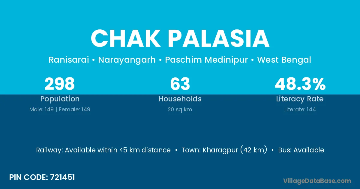 Kharagpur (42 km) is the nearest town to Chak Palasia village for major economic activities and is located approximately 42 km away.