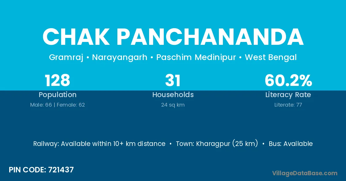 Kharagpur (25 km) is the nearest town to Chak Panchananda village for major economic activities and is located approximately 25 km away.