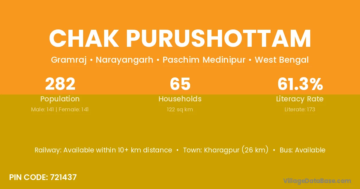 Kharagpur (26 km) is the nearest town to Chak Purushottam village for major economic activities and is located approximately 26 km away.