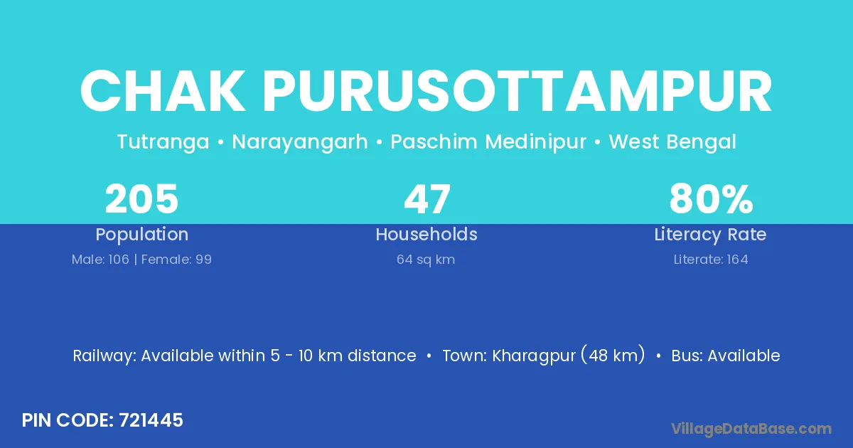 Kharagpur (48 km) is the nearest town to Chak Purusottampur village for major economic activities and is located approximately 48 km away.