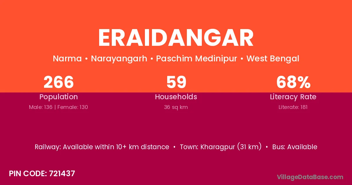 Kharagpur (31 km) is the nearest town to Eraidangar village for major economic activities and is located approximately 31 km away.
