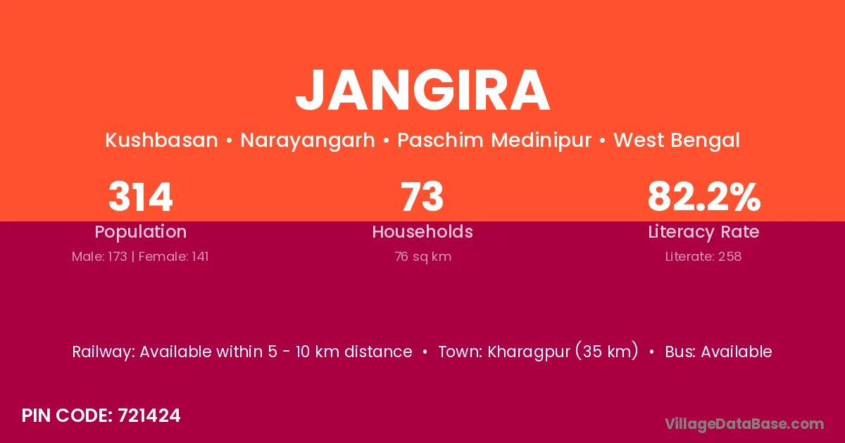 Kharagpur (35 km) is the nearest town to Jangira village for major economic activities and is located approximately 35 km away.