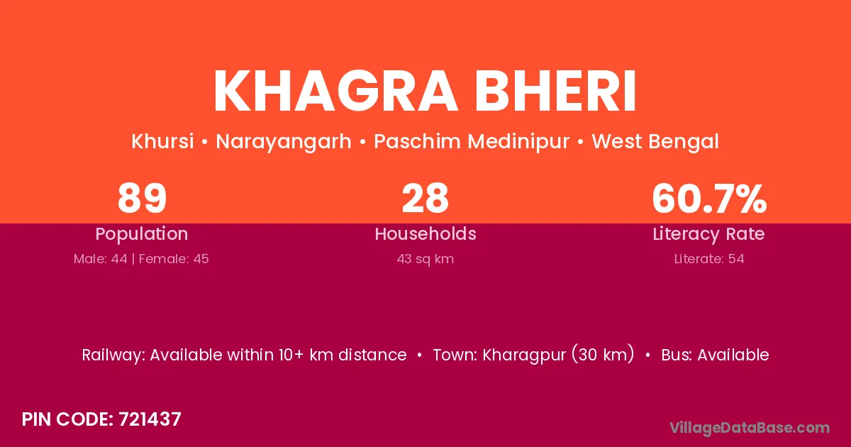 Kharagpur (30 km) is the nearest town to Khagra Bheri village for major economic activities and is located approximately 30 km away.