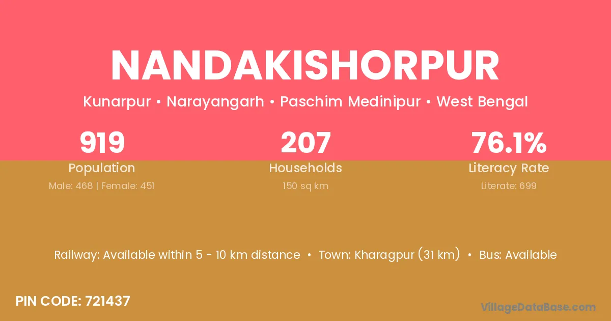 Kharagpur (31 km) is the nearest town to Nandakishorpur village for major economic activities and is located approximately 31 km away.
