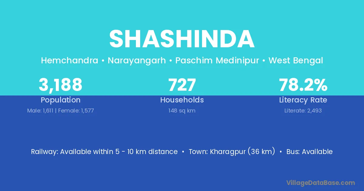 Kharagpur (36 km) is the nearest town to Shashinda village for major economic activities and is located approximately 36 km away.