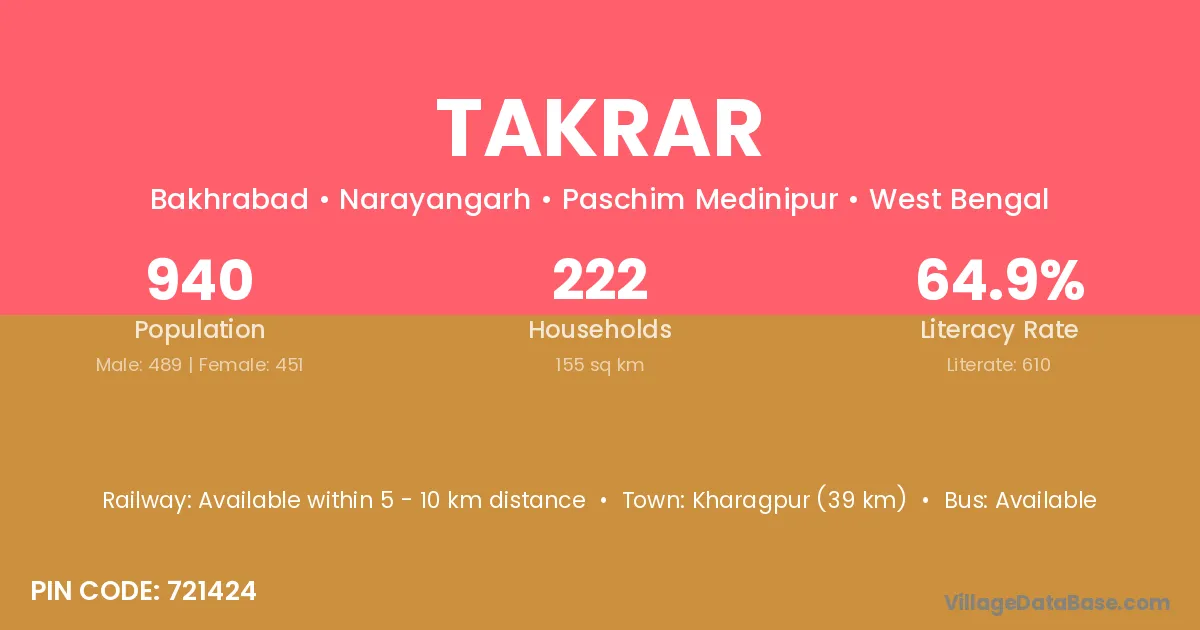 Kharagpur (39 km) is the nearest town to Takrar village for major economic activities and is located approximately 39 km away.