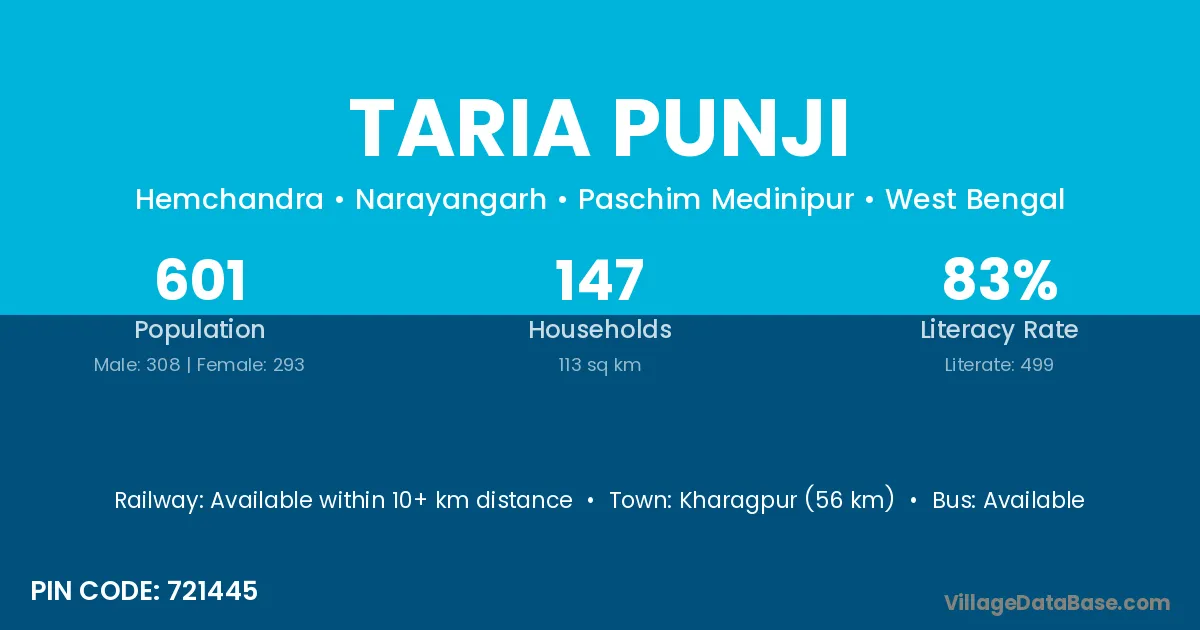 Kharagpur (56 km) is the nearest town to Taria Punji village for major economic activities and is located approximately 56 km away.
