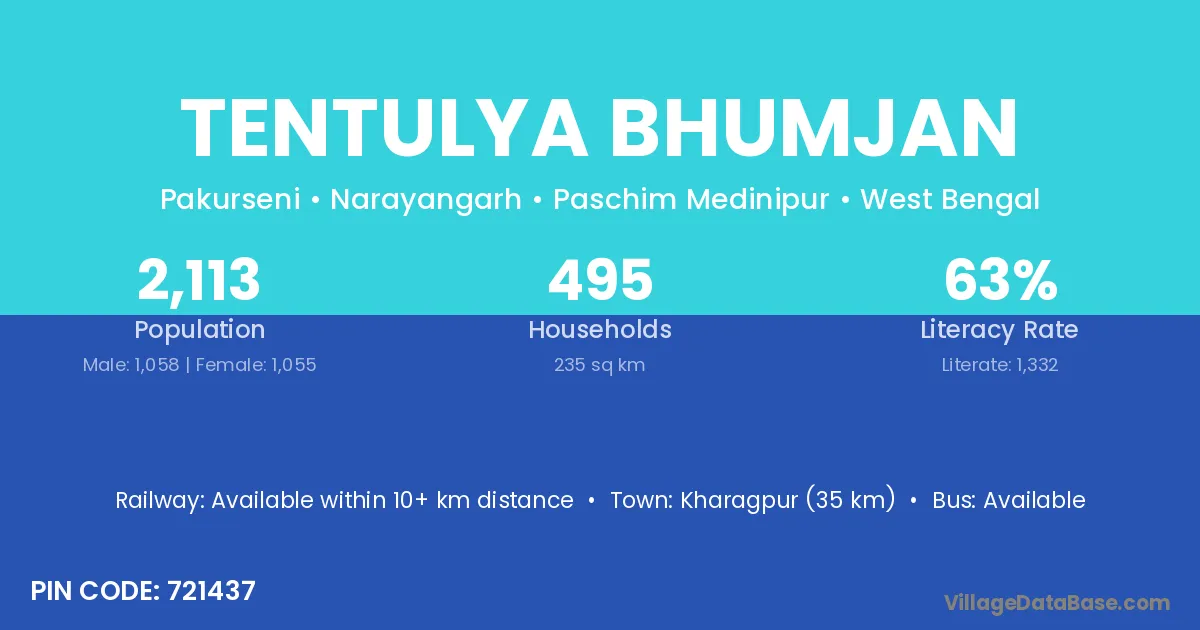 Kharagpur (35 km) is the nearest town to Tentulya Bhumjan village for major economic activities and is located approximately 35 km away.