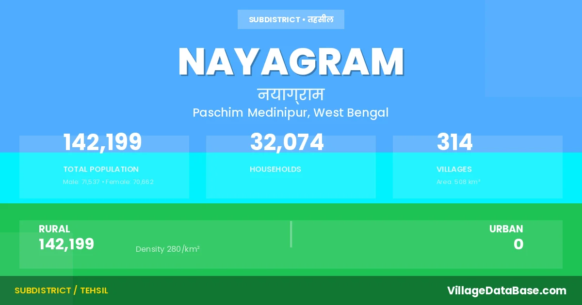 According to the 2011 census The total area of Nayagram Subdivision is 508 km², with a population of 142199 people. The population density is 280 inhabitants per square kilometre, and there are approximately 32074 houses in the sub district.