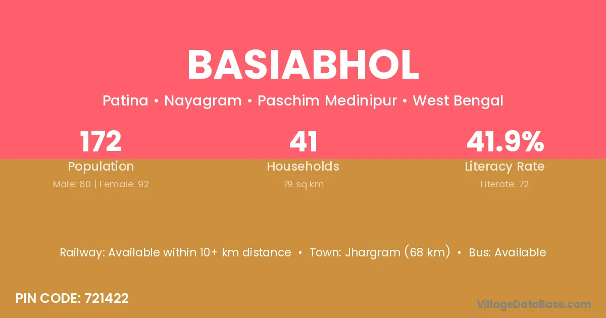 Jhargram (68 km) is the nearest town to Basiabhol village for major economic activities and is located approximately 68 km away.