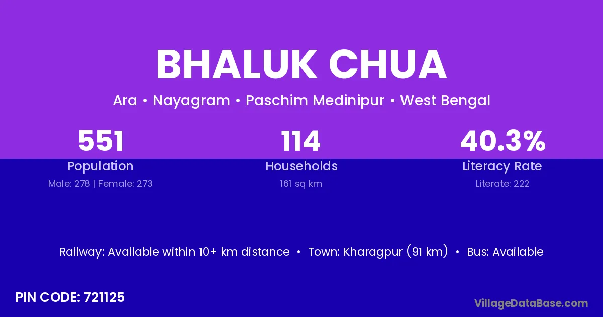 Kharagpur (91 km) is the nearest town to Bhaluk Chua village for major economic activities and is located approximately 91 km away.