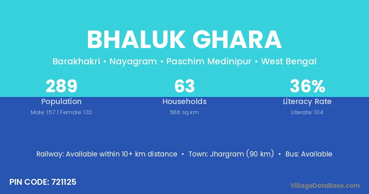 Jhargram (90 km) is the nearest town to Bhaluk Ghara village for major economic activities and is located approximately 90 km away.