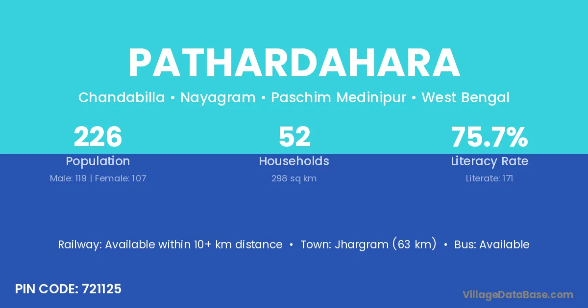 Jhargram (63 km) is the nearest town to Pathardahara village for major economic activities and is located approximately 63 km away.