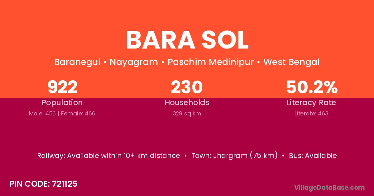 Jhargram (75 km) is the nearest town to Bara Sol village for major economic activities and is located approximately 75 km away.