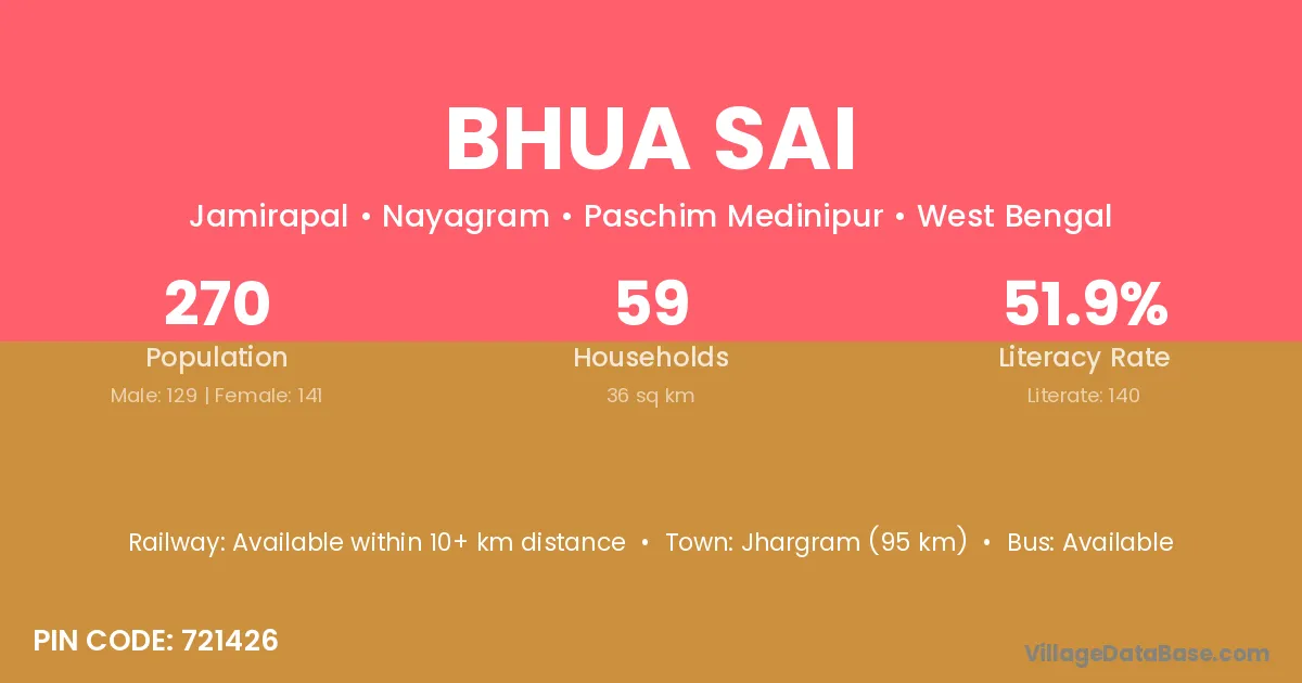 Jhargram (95 km) is the nearest town to Bhua Sai village for major economic activities and is located approximately 95 km away.