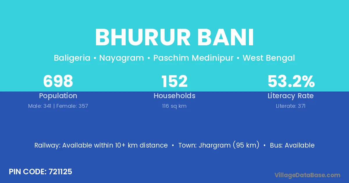 Jhargram (95 km) is the nearest town to Bhurur Bani village for major economic activities and is located approximately 95 km away.