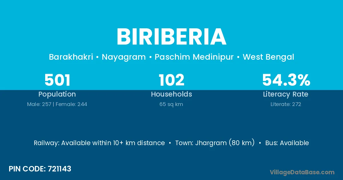 Jhargram (80 km) is the nearest town to Biriberia village for major economic activities and is located approximately 80 km away.