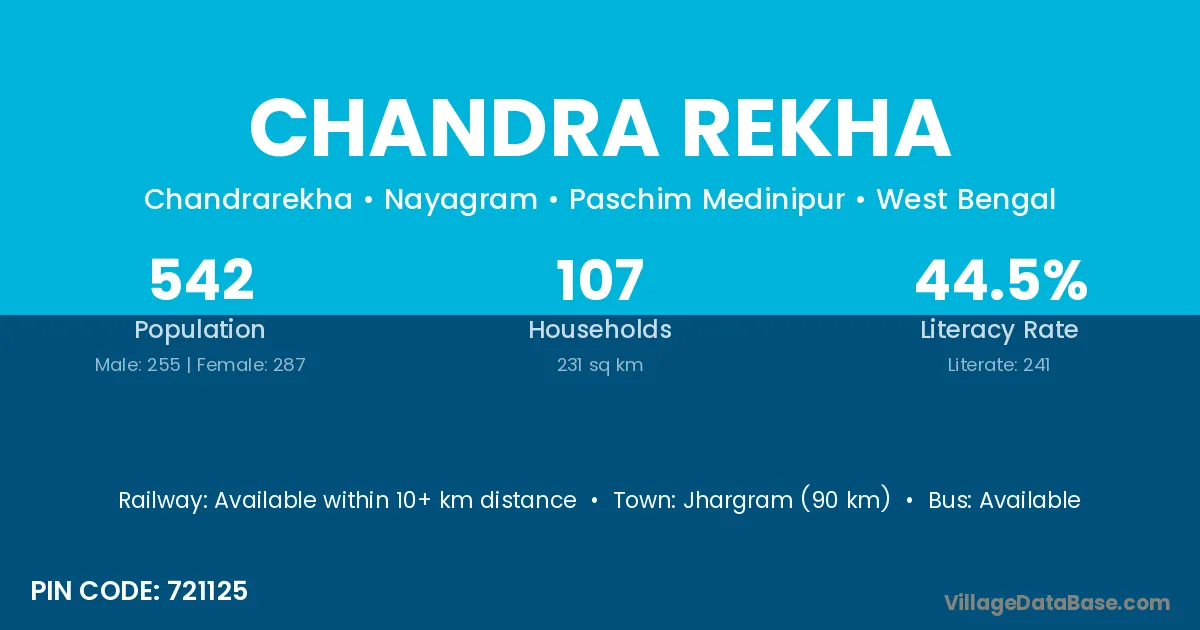 Jhargram (90 km) is the nearest town to Chandra Rekha village for major economic activities and is located approximately 90 km away.