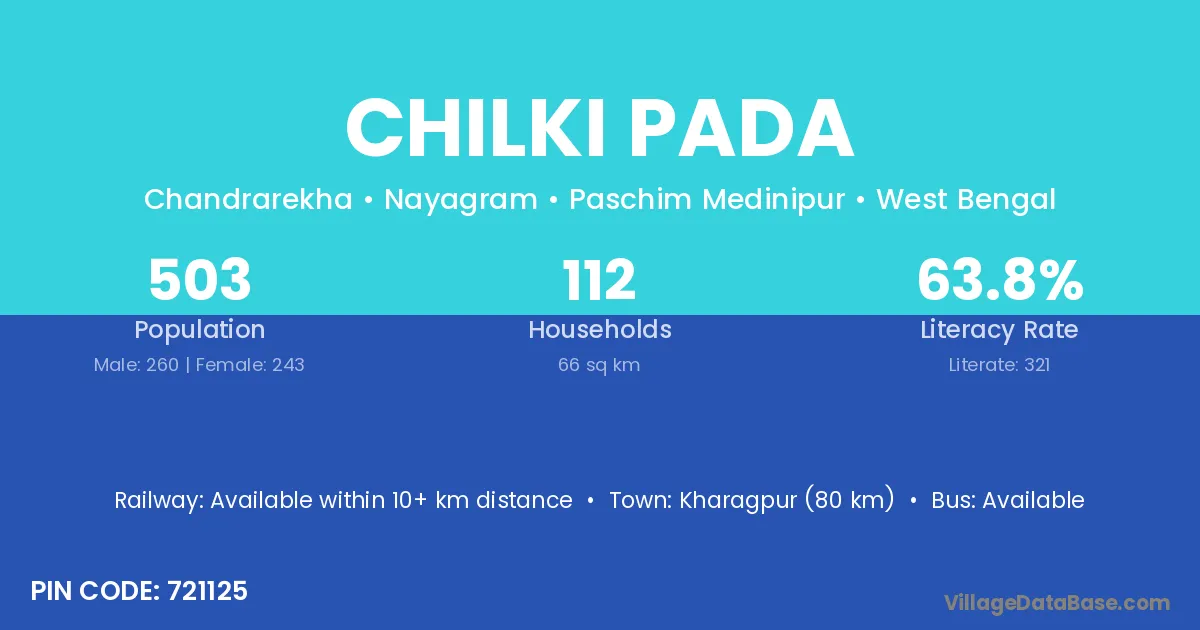 Kharagpur (80 km) is the nearest town to Chilki Pada village for major economic activities and is located approximately 80 km away.