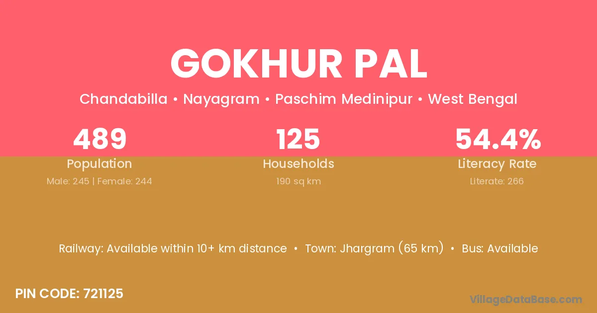 Jhargram (65 km) is the nearest town to Gokhur Pal village for major economic activities and is located approximately 65 km away.
