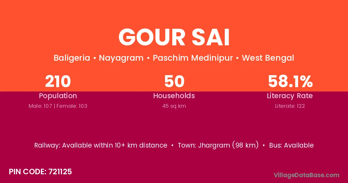 Jhargram (98 km) is the nearest town to Gour Sai village for major economic activities and is located approximately 98 km away.