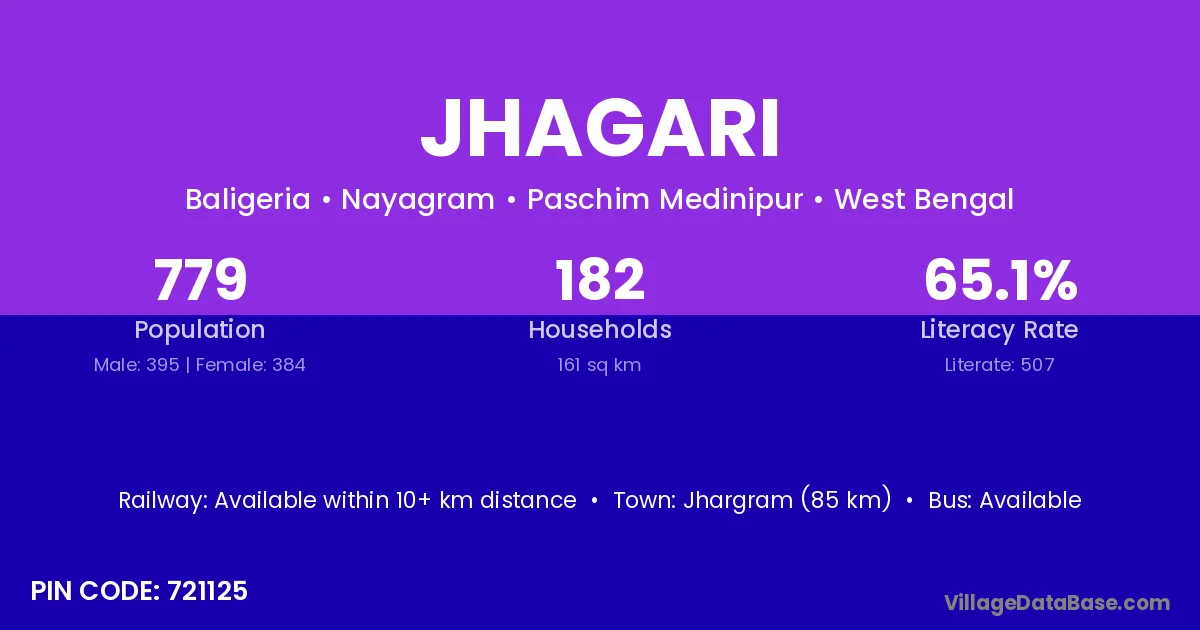 Jhargram (85 km) is the nearest town to Jhagari village for major economic activities and is located approximately 85 km away.