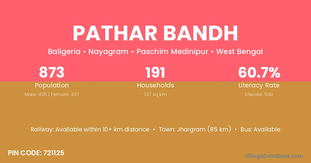 Jhargram (85 km) is the nearest town to Pathar Bandh village for major economic activities and is located approximately 85 km away.