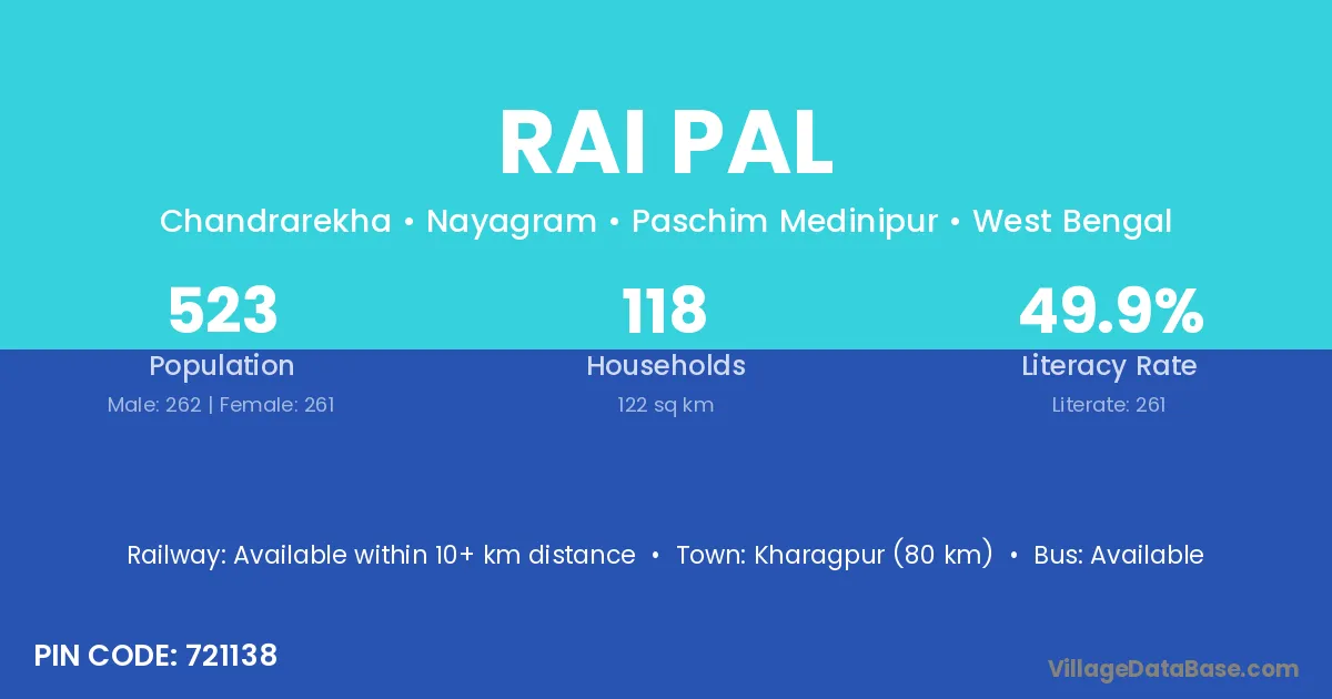 Kharagpur (80 km) is the nearest town to Rai Pal village for major economic activities and is located approximately 80 km away.