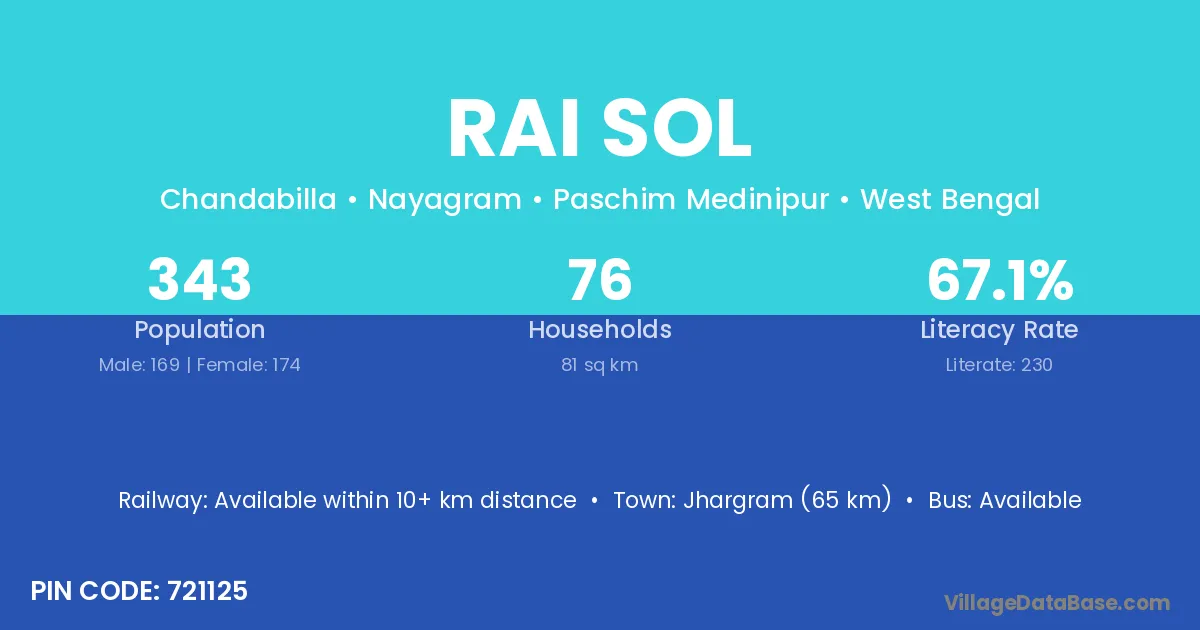 Jhargram (65 km) is the nearest town to Rai Sol village for major economic activities and is located approximately 65 km away.