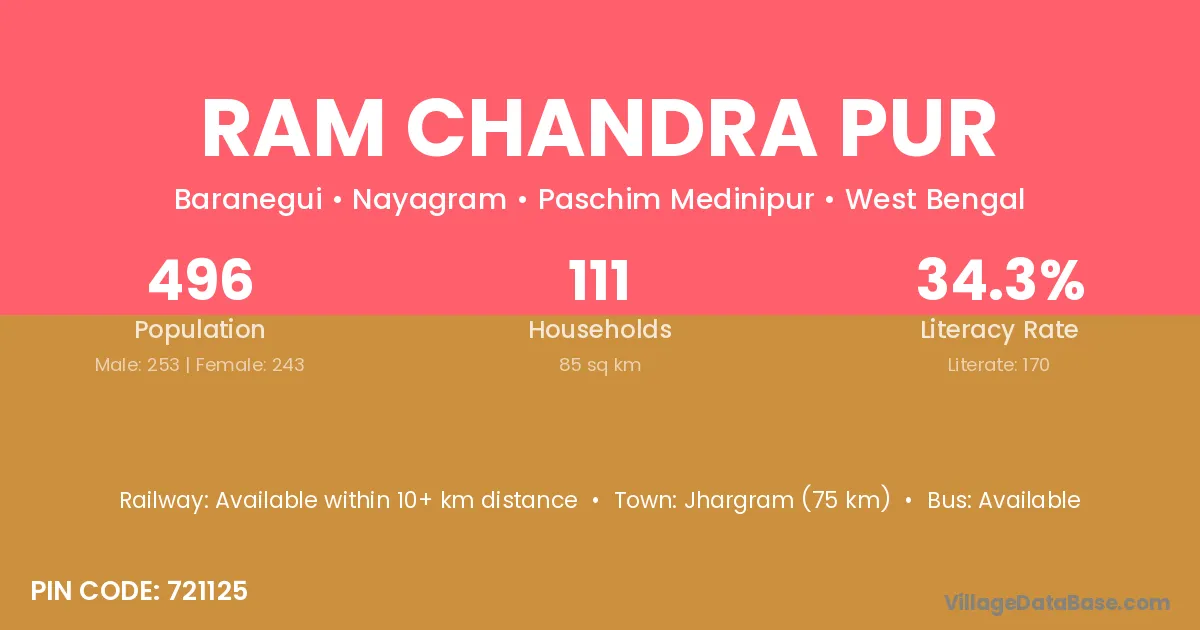 Jhargram (75 km) is the nearest town to Ram Chandra Pur village for major economic activities and is located approximately 75 km away.