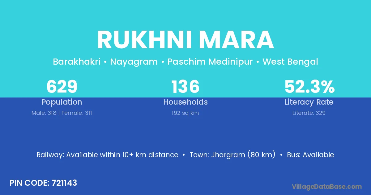 Jhargram (80 km) is the nearest town to Rukhni Mara village for major economic activities and is located approximately 80 km away.