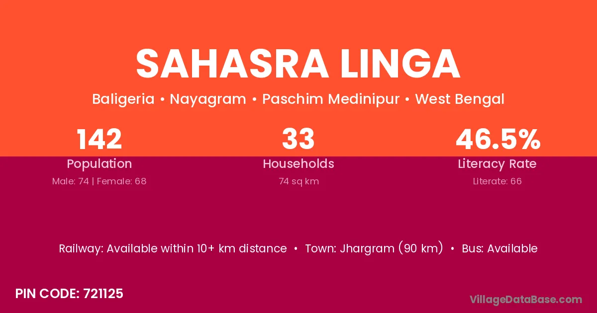 Sahasra Linga village has a total population of 142 people, of which 74 are males and 68 are females.